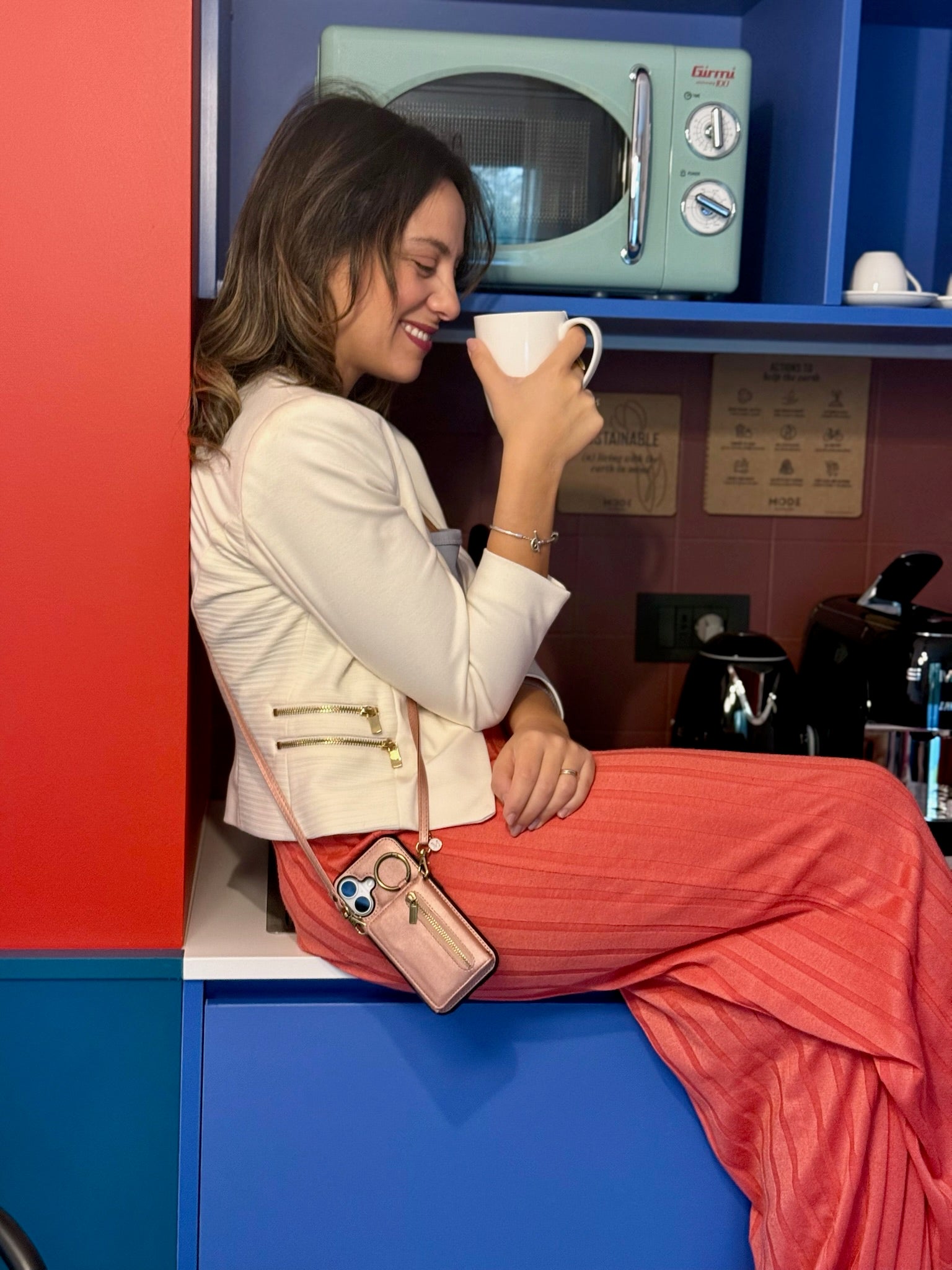 Tutto a portata di mano : 4 scomparti nascosti per tessere, carte e monete. Supporto da tavolo integrato, per video e chiamate. Tracolla regolabile e removibile . Anello porta chiavi a molla , anche come presa anti-caduta. Pronta ad essere organizzata con stile?