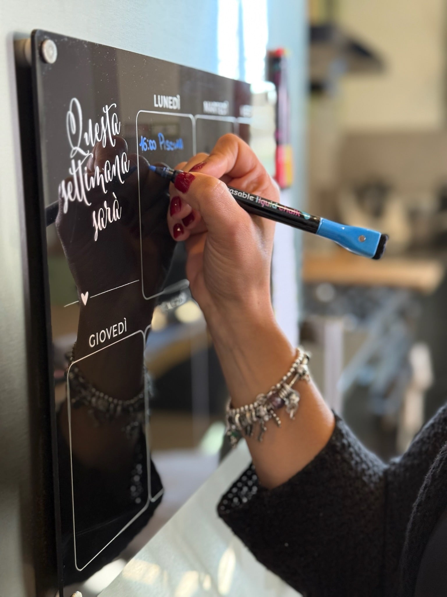 La lavagna è in acrilico rigido di alta qualità, resistente e dal design raffinato. La superficie liscia permette una scrittura precisa e un effetto lucido elegante.