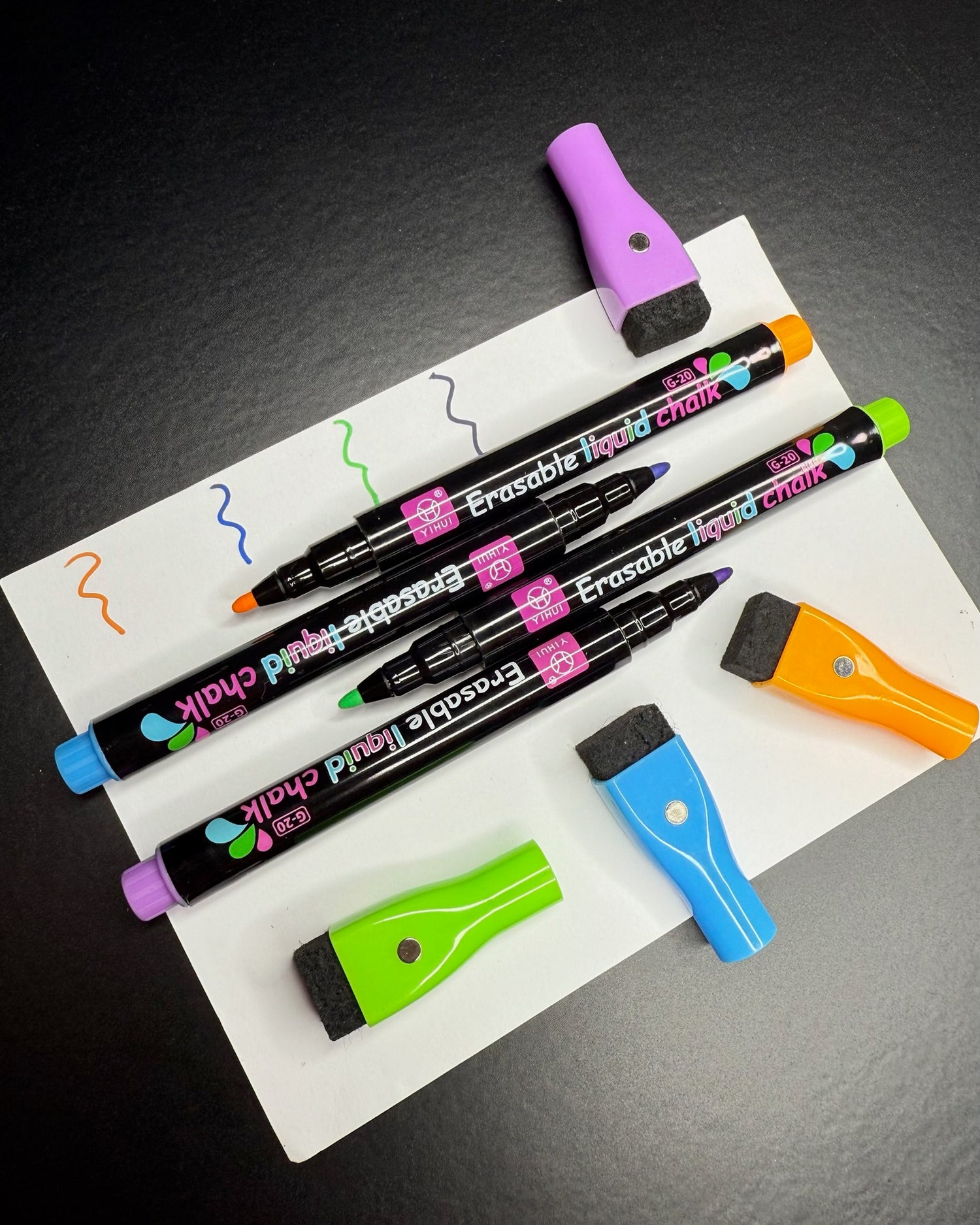 4 Pennarelli magnetici, a gesso liquido persistente e comda spugnetta integrata.